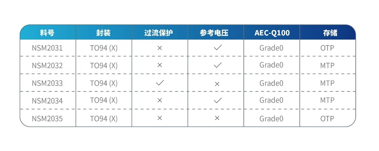 NSM203x產品系列包含了5個產品型號,即NSM2031、NSM2032、NSM2033、NSM2034和NSM2035。考慮過流保護輸出、參考電壓輸出、存儲器類型(單次可編程OTP、可重復編程MTP)、封裝形式等多個維度,NSM203x系列可以全面覆蓋各個應用場景下的不同系統需求。各產品均有車規和工規型號,其中車規級別產品滿足AEC-Q100 Grade 0的可靠性要求,可在-40~150℃的嚴苛環境下勝任工作。