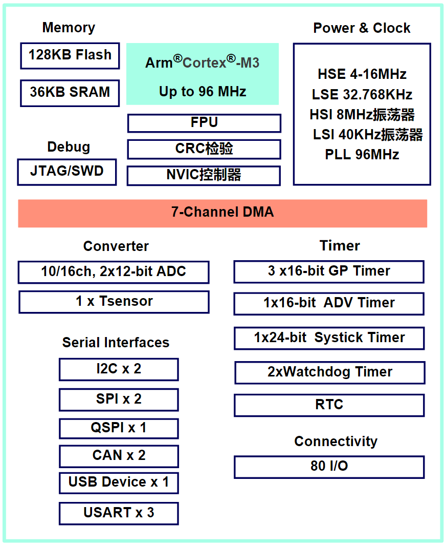 片上資源豐富,以標準功能、高可靠性能為用戶應用場景帶來更適配的選擇;同時內(nèi)置專用于浮點運算的FPU協(xié)處理單元,掛在AHB總線上,能夠快速處理較為復雜的浮點運算,例如掃描槍的解碼算法、PID算法、快速傅里葉變換等,加快系統(tǒng)處理能力。
